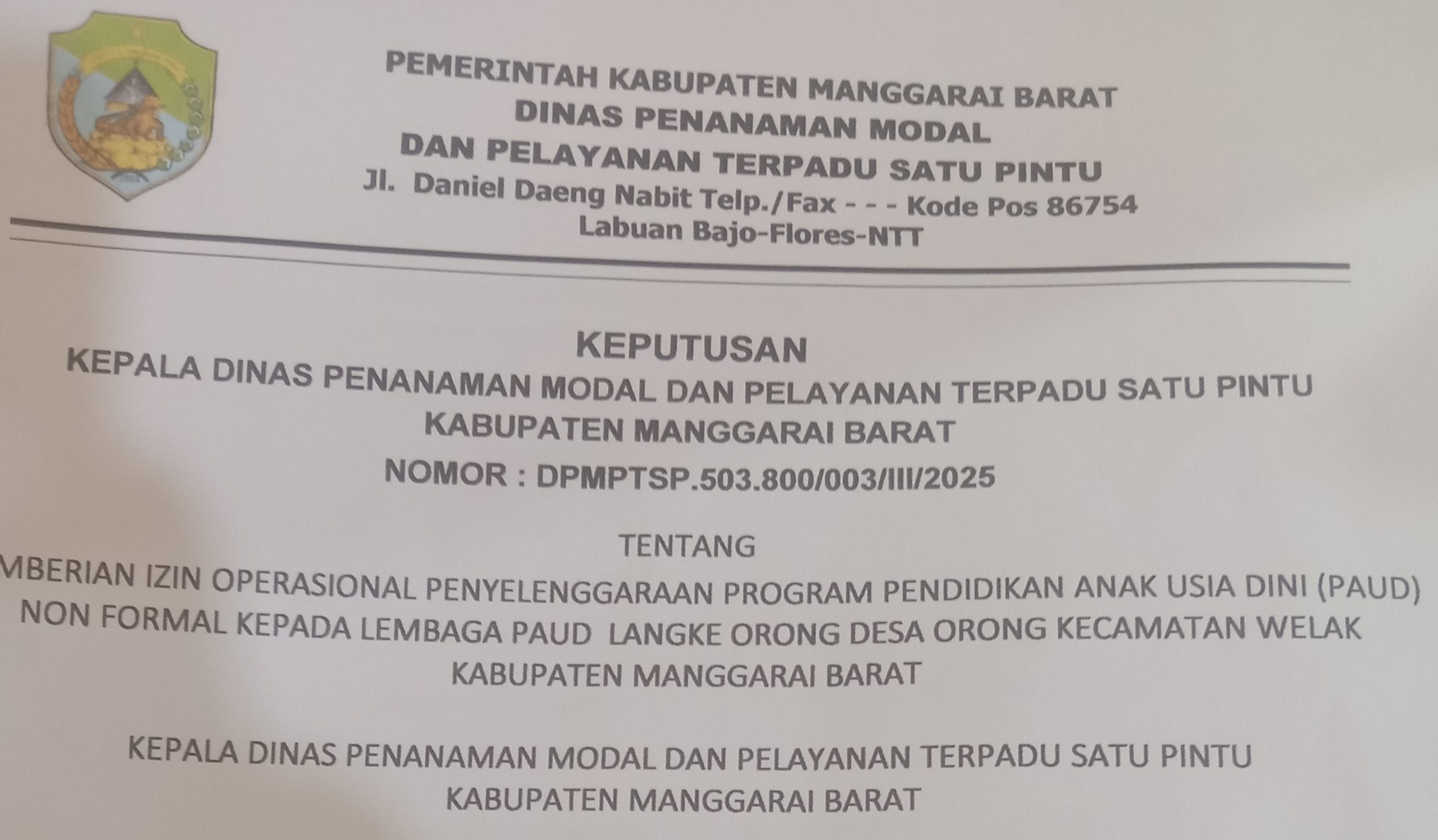 Kepala Desa Orong, Stefanus Hadur menyampaikan terimakasih kepada Pemerintah Kabupaten Manggarai Barat yang telah memberikan izin operasional Paud Langke Orong, Desa Orong Kecamatan Welak melalui Dinas Penanaman Modal dan Pelayanan Terpadu Satu Pintu Manggarai Barat.