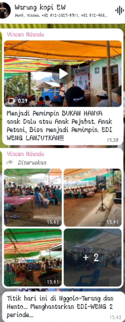 “Titik hari ini di Nggolo-Terang dan Hento….menghantarkan Edi Weng 2 Periode,” cuit Vincen pada Foto yang dibagikan di group Warung Kopi EW