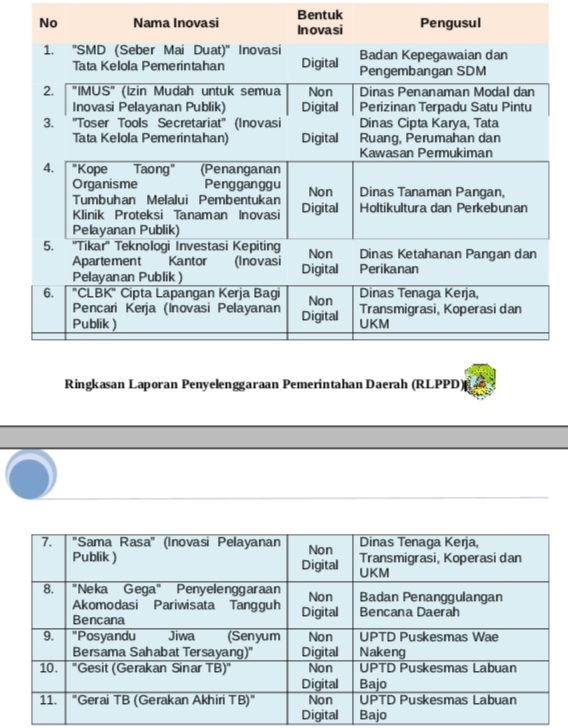 Dalam rangka mendorong pertumbuhan pembangunan dan mengoptimalkan pelayanan kepada masyarakat sebagai upaya dalam meningkatan kinerja Pemerintah Daerah serta sesuai dengan amanat Peraturan Pemerintah Nomor 38 Tahun 2017 tentang Inovasi Daerah, maka Pemerintah Kabupaten Manggarai Barat menginisiasi beberapa Inovasi Daerah berdasarkan kebutuhan masyarakat saat ini antara lain: